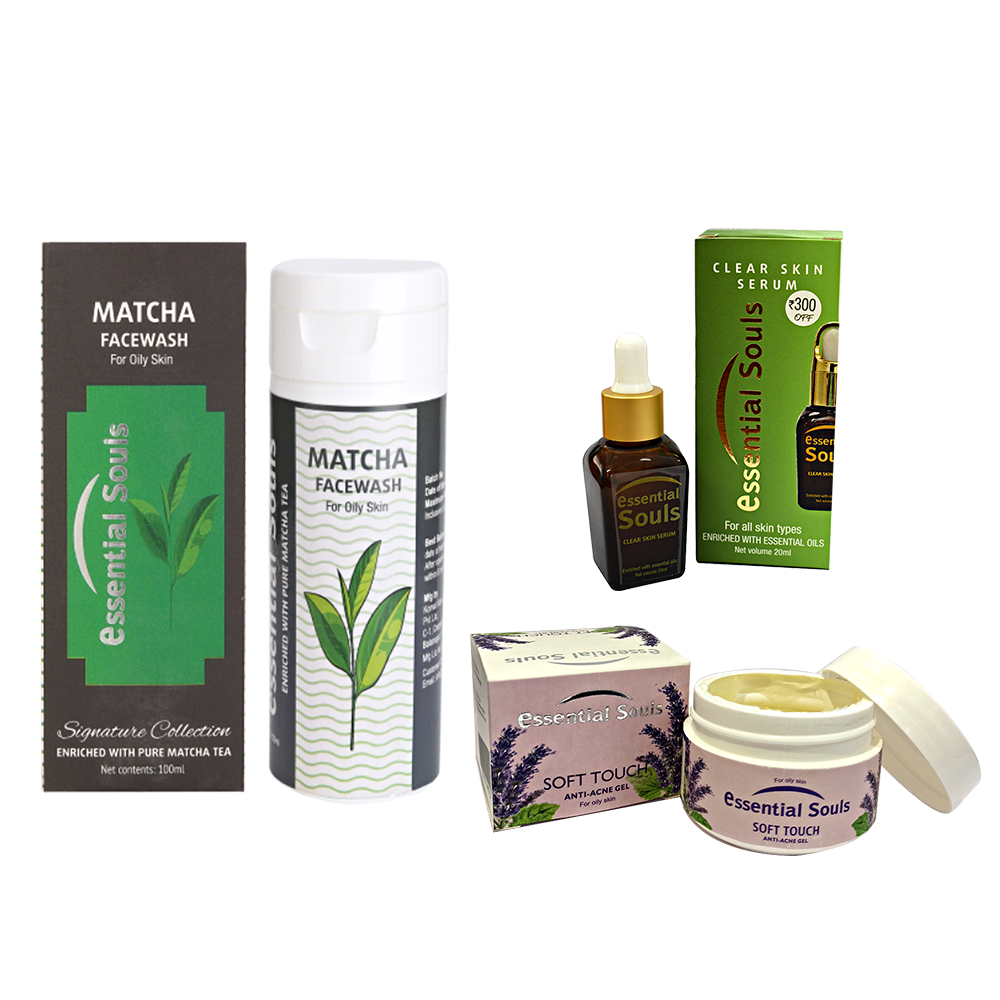 Essential Souls Clear Skin Oil (20 ml) - contains essential oils Tea Tree, Lavender French, German Chamomile and Geranium. This active formula helps reduce acne scars and pimples.