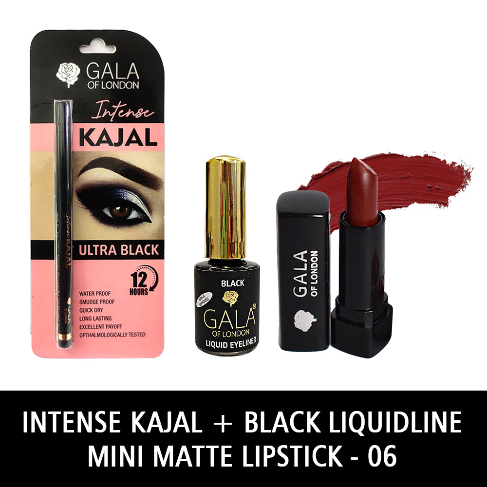 Gala of London Intense Kajal, Retro Eyeliner Black & Mini Matte Lipstick 06 Bride Combo