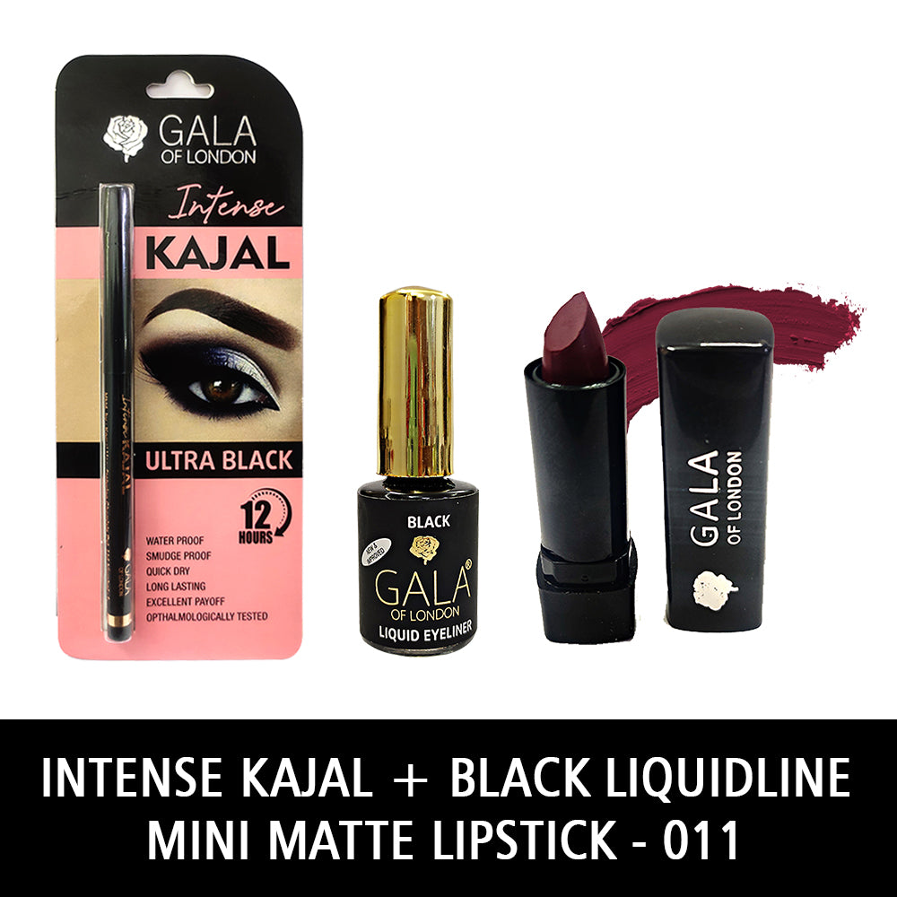 Gala of London Intense Kajal, Retro Eyeliner Black & Mini Matte Lipstick 10 Purple combo